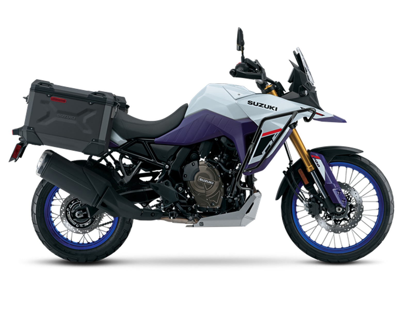 - The V-STROM 800DE Adventure has a durable aluminum under cover. This thick aluminum “skid plate” provides additional engine and exhaust protection when riding over rocks and rough terrain. Also included are Suzuki’s ADV-style, 37-liter aluminum panniers that attach to powder-coated, stainless-steel carriers.