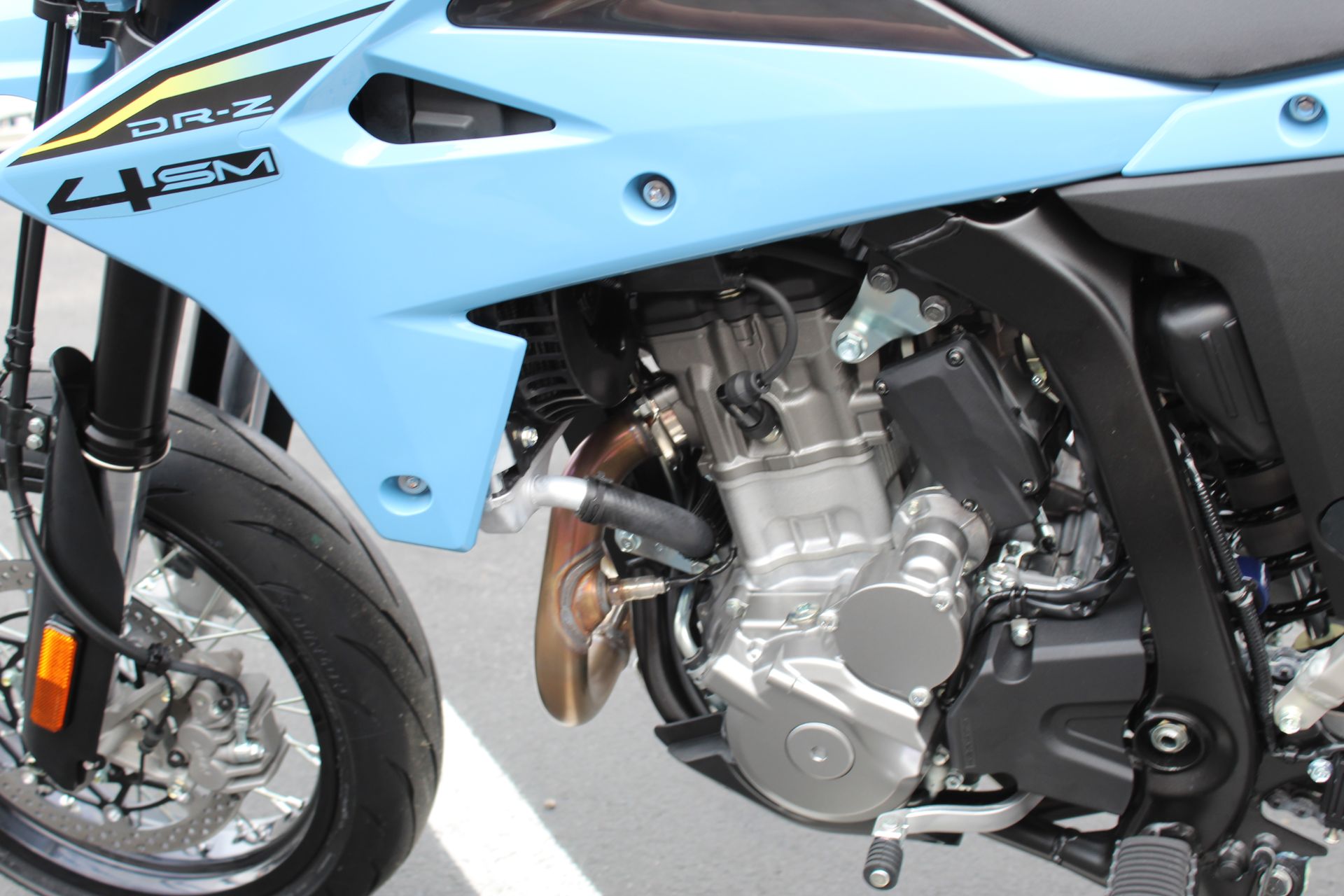 The DR-Z4SM's 17-inch wide-spoke wheels are designed to allow an aggressive SuperMoto feel that this motorcycle can achieve. Fully adjustable KYB suspension and new Dunlop SPORTMAX Q5A tires ensure optimal handling and grip. Sleek LED lighting, vibrant bodywork, and ergonomic touches complete the motorcycle, making the DR-Z4SM the ultimate package.