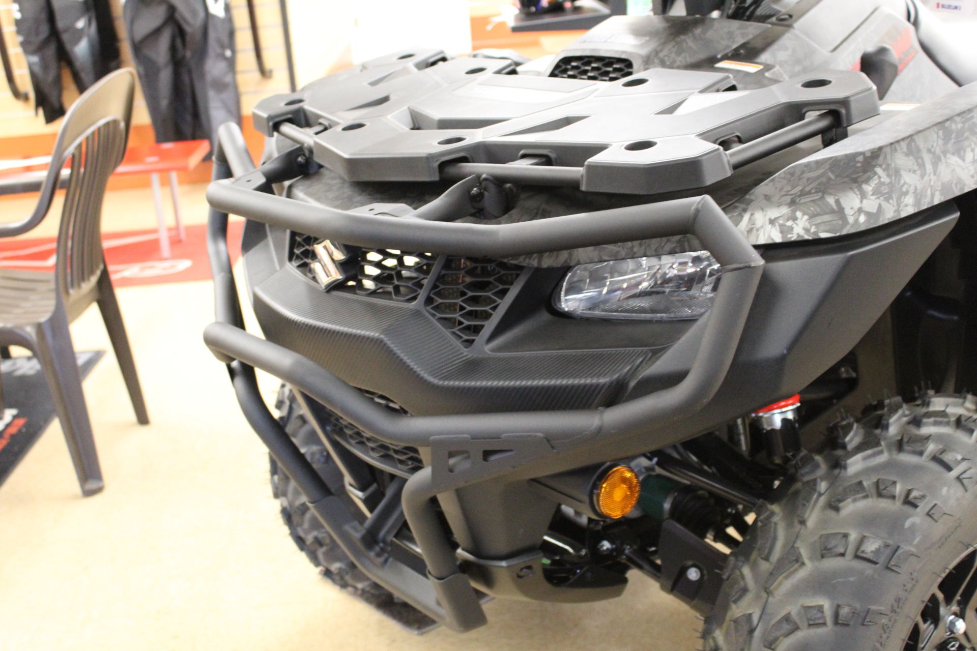 - A variety of Genuine Suzuki Accessories are available, including winches, windshield, front and rear bumpers, quick-release snowplow, aluminum skid pans, rack extensions, utility box, and more.